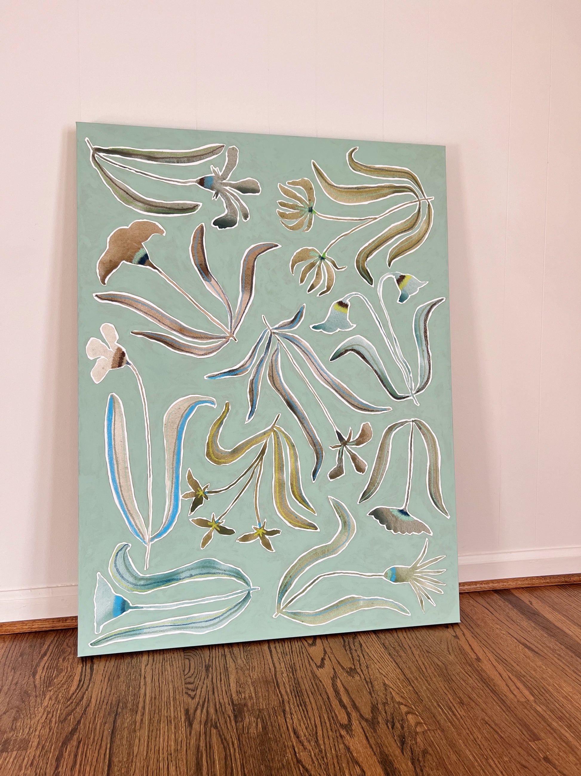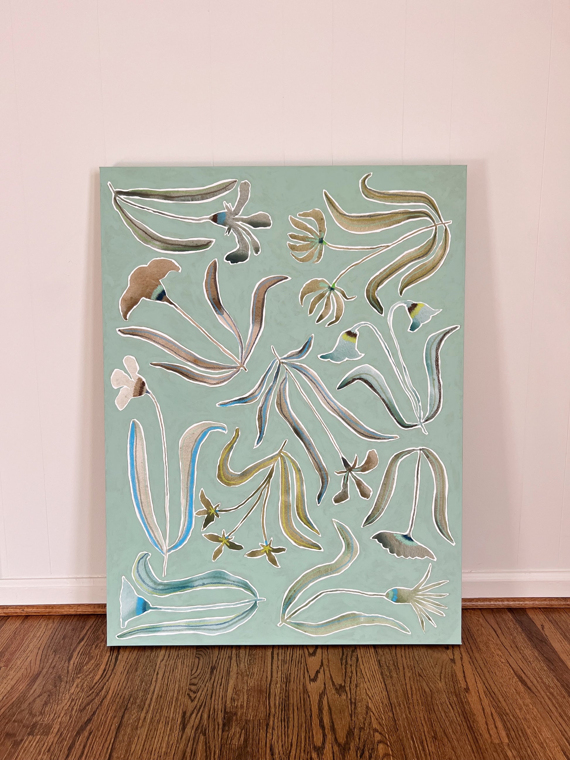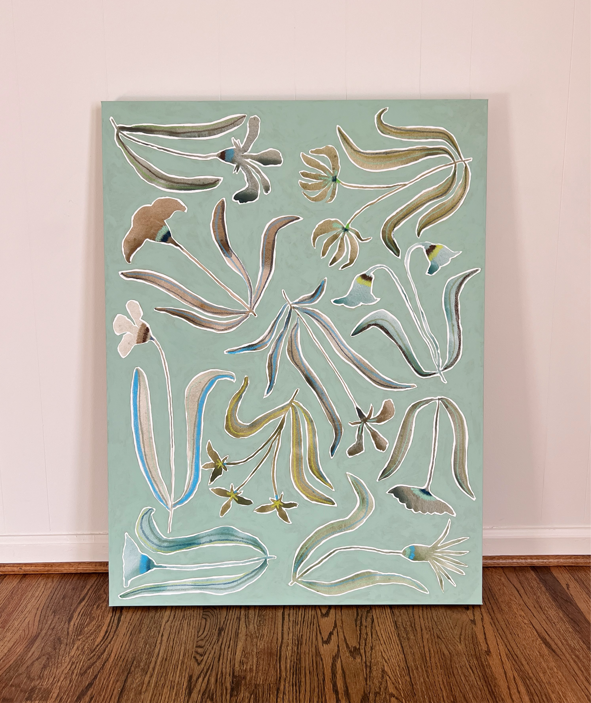 Acrylic paint, watercolor and oil pastel on canvas